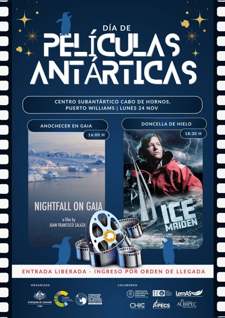 En esta línea, la Embajada de Australia en Chile, a solicitud de la Fundación Coalición de Jóvenes Antárticos de Punta Arenas, es parte de las entidades organizadoras del “Día de Películas Antárticas”, evento que se desarrollará esta jornada en el Centro Subantártico Cabo de Hornos, en Puerto Williams 🎥 (más información, en el afiche 📄).