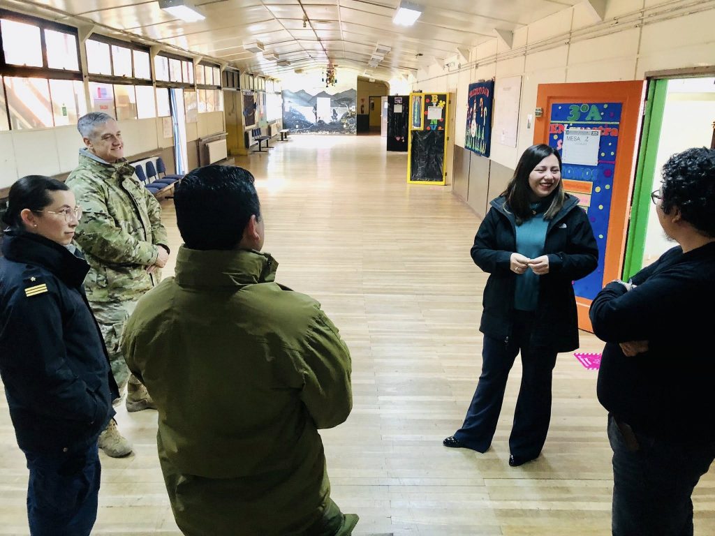Acompañada por representantes de la Armada de Chile y Carabineros, la delegada presidencial provincial de la Antártica Chilena, Constanza Calisto Gallardo, asistió al Liceo Donald Mc Intyre Griffiths, donde fue recibida por el delegado de la Junta Electoral de Cabo de Hornos, Ericson Díaz.